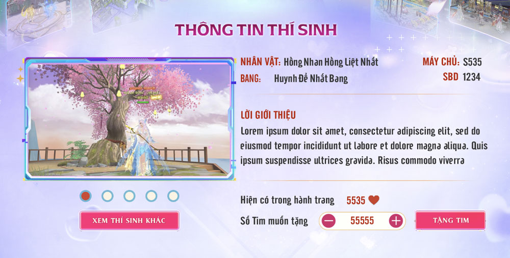 - Khán giả có thể xem chi tiết các hạng mục hình ảnh, bài giới thiệu dự thi của thi sinh. Đồng thời cũng thấy được số lượt bình chọn (thả tim) hiện có của mình.