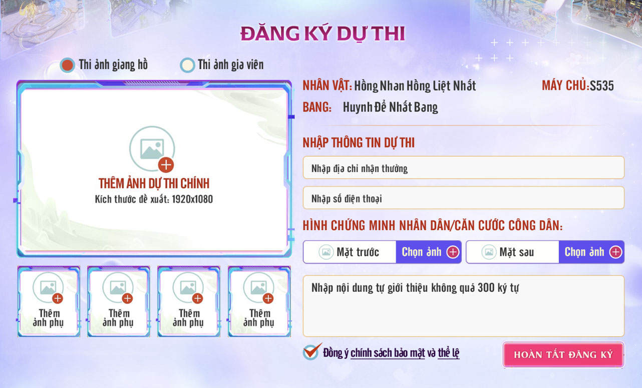 - Thí sinh khi đã báo danh và xét duyệt thành công, khi vào lại mục Đăng Ký Dự Thi sẽ thấy trang thông tin của mình gồm tên nhân vật, Bang hội, máy chủ, các bức ảnh dự thi... kèm theo số báo danh. Thí sinh có thể gửi số báo danh đến bằng hữu để giới thiệu và kêu gọi bình chọn cho mình.