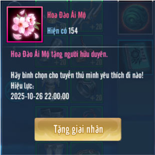 - Trong thời gian dự báo và diễn ra vòng 1 (10:00 11/10/2025 đến 21:59 26/10/2025), có thể nhận Hoa Đào Ái Mộ bằng cách sau: