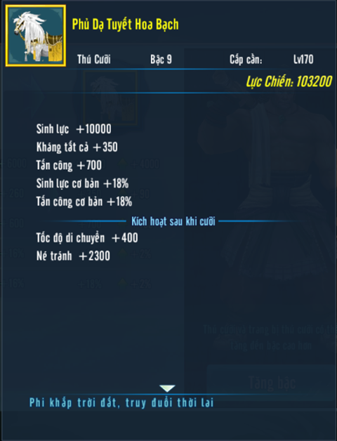 - Máy chủ đã mở giới hạn cấp 179, thú cưỡi bậc 8 Bạch Ngọc Sương Vũ Câu có thể nâng cấp thành thú cưỡi bậc 9 Phủ Dạ Tuyết Hoa Bạch. Thành chủ Tương Dương sau Công Thành Chiến cũng sẽ nhận được Thú Cưỡi Bậc 9 Tố Vũ Ngân Hà Câu.