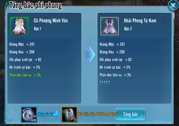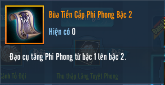 - Quý Đại hiệp có thể sử dụng Bùa Tiến Cấp Phi Phong Bậc 2 và Nhập Vi Kính để tăng Phi Phong Bậc 1 lên Bậc 2.