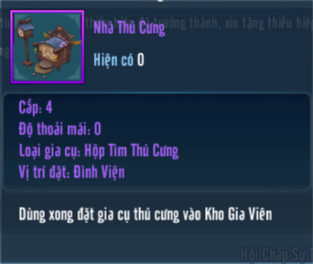 - Đại hiệp có sở hữu cho mình một Thú Cưng bất kì có độ Phát Triển đạt tối đa, hệ thống sẽ gửi tặng đại hiệp một Gia Cụ Nhà Thú Cưng.