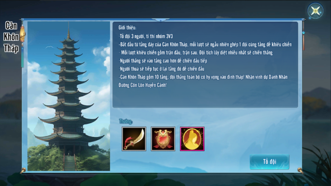 - Càn Khôn Tháp cần tổ đội 3 người mới có thể tham gia