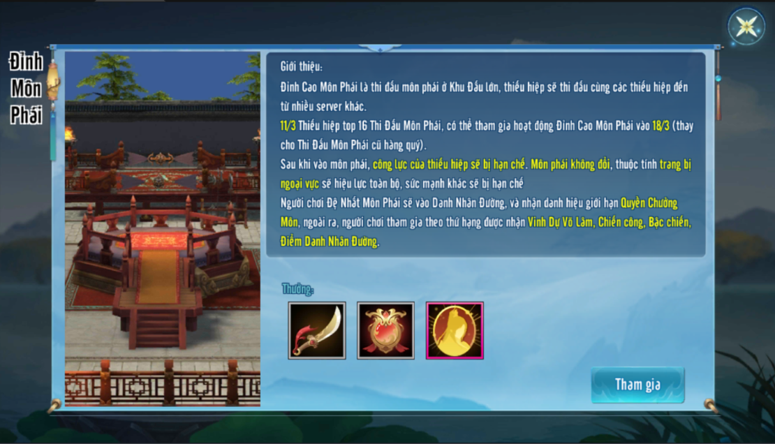 - Đỉnh Môn Phái yêu cầu quý Đại Hiệp đạt Top 16 Thi Đấu Môn Phái của ngày 11/03 thì mới có thể tham gia