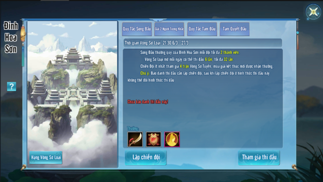 - Đại hiệp chỉ có thể tham gia duy nhất 1 hình thức thi đấu